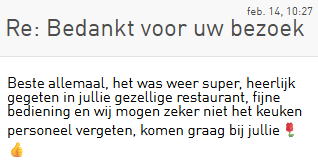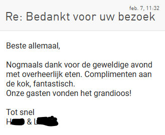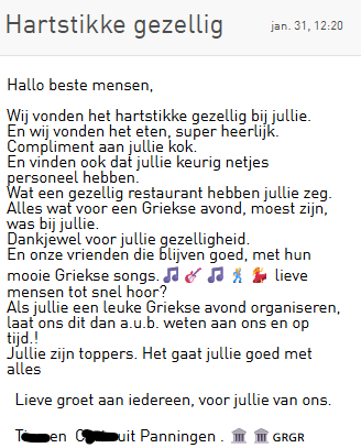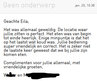 Bij Eliá draait alles om de unieke ervaring die we onze gasten bieden. Van de warme Griekse gastvrijheid tot de heerlijke gerechten die met zorg zijn bereid, we willen dat elke bezoeker zich speciaal voelt. We zijn altijd op zoek naar manieren om onze service en gerechten te verbeteren. Daarom nodigen we u uit om uw mening met ons te delen. Uw feedback is van onschatbare waarde en helpt ons om de Eliá ervaring nog beter te maken!
